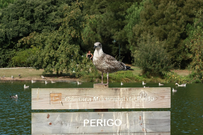 de gente e aves no lago do parque da cidade do Porto.